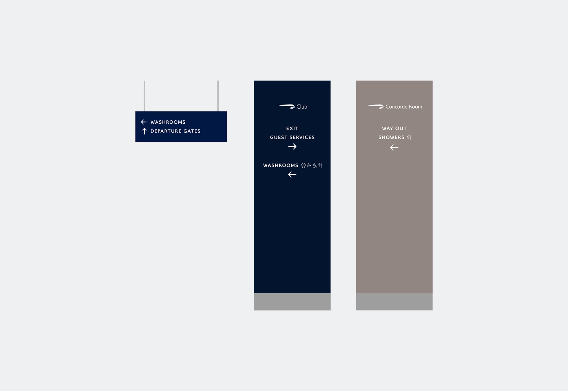 I developed a new signage design system for British Airways lounges. Paring back the designs created for landside signage, the airside signage is simpler and more refined, reflecting the quiet tranquility of the lounge spaces.
